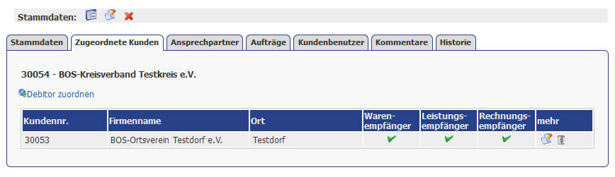 In der Verwaltung der Kundenstammdaten können Sie verschiedene Ansprechpartner des Kunden sowie verschiedene Kundenkonten miteinander verknüpfen. Die Verknüpfung ermöglicht es Ihnen, die Aufträge unterschiedlichen Waren-, Leistungs- und Rechnungsempfängern zuordnen zu können, ohne in jedem Auftrag die Daten wieder neu erfassen zu müssen.